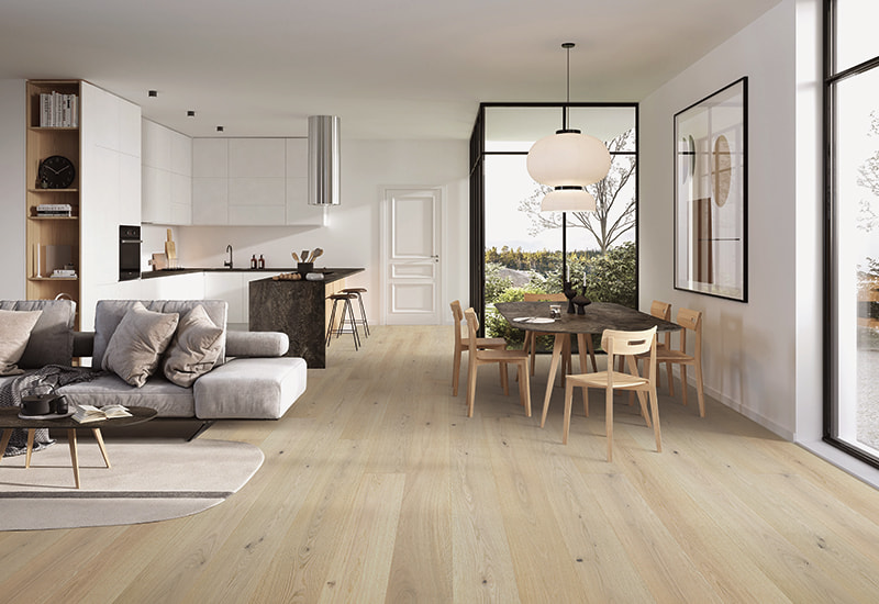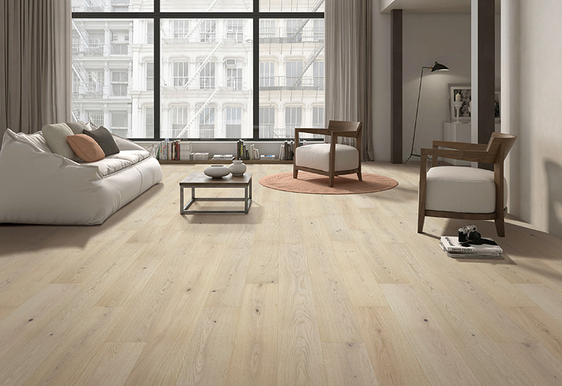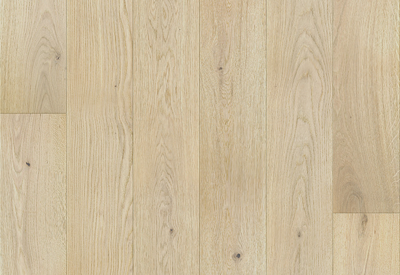 De bleke tonene i den hvite eiken skaper en lys, luftig atmosfære, bra for å forbedre lyset og komplementere en rekke interiørstiler, fra minimalistisk til tradisjonell. Den bleke finishen fremhever treets naturlige korn og tekstur mens du gir et mykt utseende som kan utfylle et bredt spekter av design til begge makene. sammenhengende og balansert utseende. Et UV-lakkbelegg gir et ekstra lag med beskyttelse til overflaten, noe som gjør det motstandsdyktig mot riper, flekker og falming over tid. Dette belegget bevarer treets naturlige skjønnhet og sikrer at gulvet opprettholder sin glans selv i høye trafikk.